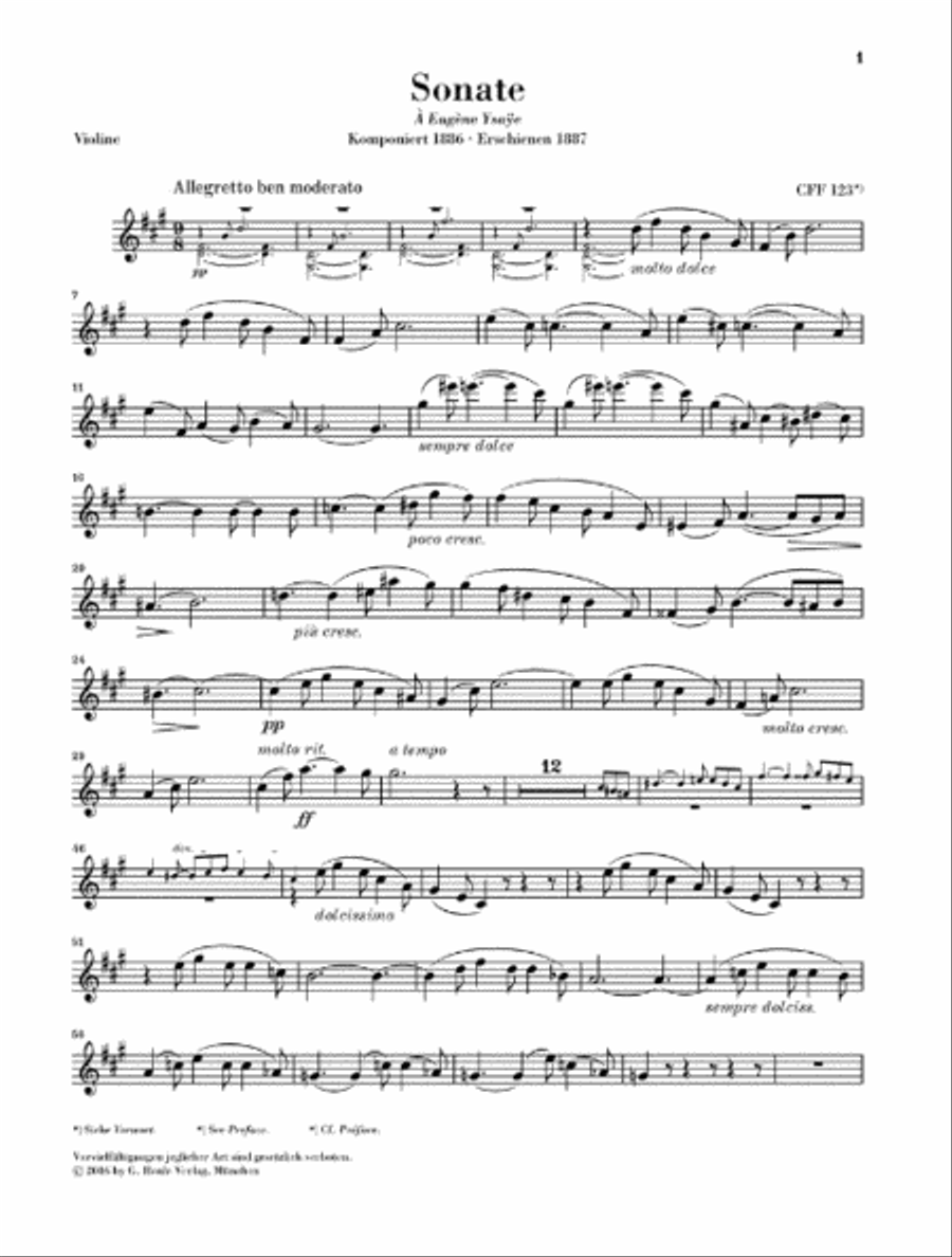 Unlike other late works by Franck, the Violin Sonata of 1886 found a friendly reception among critics and public from the outset. It is dedicated to Eugéne Ysaÿe, who was attracting much attention at the time with his flawless violin technique. Ysaÿe was so inspired by the Sonata that he promised, “I will play this masterpiece wherever I can find an artistically-minded pianist.” Nothing has changed to the present day regarding the work's continuing popularity, but it was time to revise Henle's previous edition to reflect the latest research. In the intervening period it has been shown that Franck was actively involved in reading the proofs for the printed edition, meaning that the first edition, which contains many difference from the autograph, has become the basis for our new one. The markings of the violin part of the edition are by Yehudi Menihin; Daniel Hope has undertaken the minor changes required by the revised musical text.