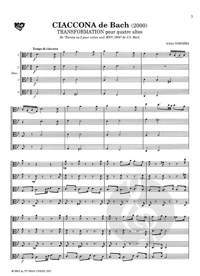 Bach's Chaconne, a masterpiece of solo violin, was arranged for four violas by Ichiro Nodaira at the request of Viola Space 2000. It premiered on May 29, 2000, at Casals Hall in Tokyo, and is now a classic arrangement that has become a staple for viola ensembles.
