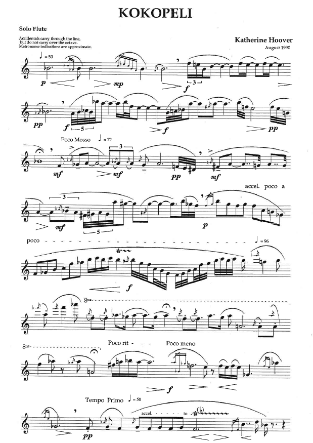 Kokopeli, the flute player, was a great mahu, or legendary hero of the Hopi, and of other Native Americans living in the Southwestern area of the United States. He is said to have led the migrations through the mountains and deserts, the sound of his flute echoing through the great canyons and cliffs. In this piece I have tried to capture some of this sense of spaciousness, and of the Hopi's deep kinship with this land. This piece has also been influenced by Native American flute songs and sounds - Katherine Hoover.