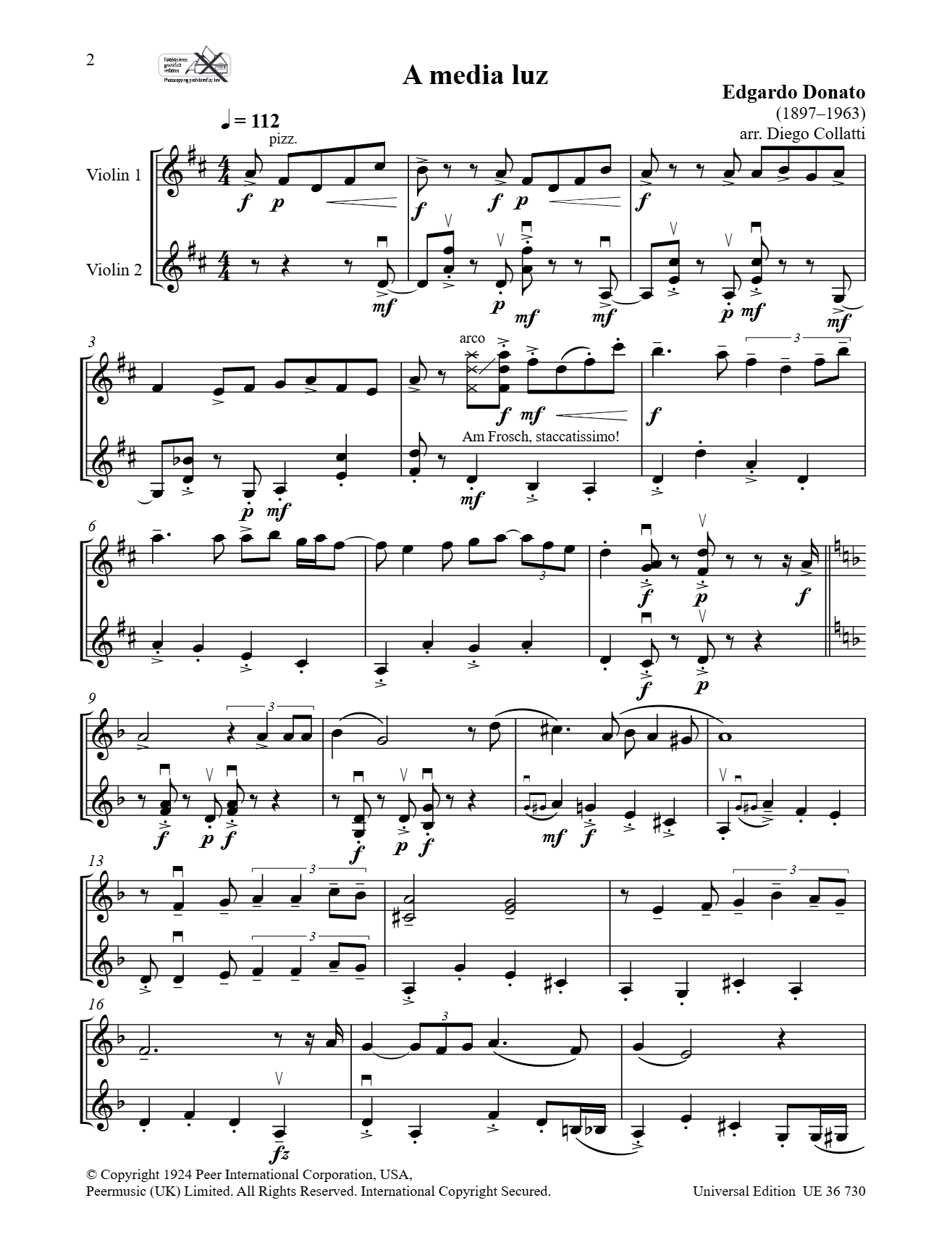 Tango is full of life and passion - the fact that this love affair of music and rhythm has not lost any of its fascination is demonstrated these classic tango pieces that have been selected for this collection and arranged for two violins. When Astor Piazolla, Vicente Greco, and Angel Villoldo meet in an edition of tango classics, entertainment and expertise of the highest level are sure to ensue. In addition to one of his own compositions, arranger Diego Collatti has selected some of the most popular tango tunes to be arranged for two violins, among them "Libertango", "El Choclo", and "A media Luz". Collatti, who is considered an expert in Argentine tango, has brilliantly and expressively highlighted the two violin parts, which have been essential elements of the tango tradition since its beginning. The duets' characteristic phrasing opportunities combined with their dynamic shading and diverse articulation enhance their value as entertaining concert pieces and deeply authentic ensemble repertory additions. Melancholic tunes, rhythmic precision, and untamed passion can be found in this stylistically diverse collection, the compositional art of which showcases the full emotional range of the tango tradition.