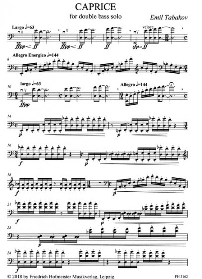 Emil Tabakov (*1947) is a Bulgarian conductor, composer, and double bassist. He has written nine symphonies, concertos for orchestra with and without solo instruments, a Requiem based on a Latin text, and chamber music, as well as works for solo instruments. Most of his works have been commissioned by international festivals and established artists. Tabakov's music, in general and especially in this Caprice for solo double bass, is music of movement. It presses forward and is characterized by the composer's brilliant technique with which he manipulates the material, creating thesis and antithesis, as well as highs and lows.