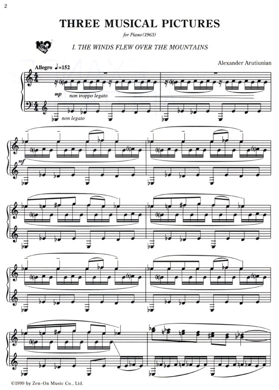 이 곡들은 아르메니아 현대 작곡가 중 가장 대표적인 작곡가 중 한 명인 아르투니안의 세 곡의 피아노 독주곡입니다. 1963년에 작곡된 이 중급 수준의 곡들은 독특한 아르메니아적 색채를 풍깁니다.