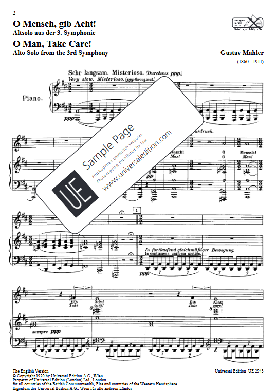 Mahler O Man, Take Care! Alto solo from the 3rd symphony for Alto Voice and Piano
