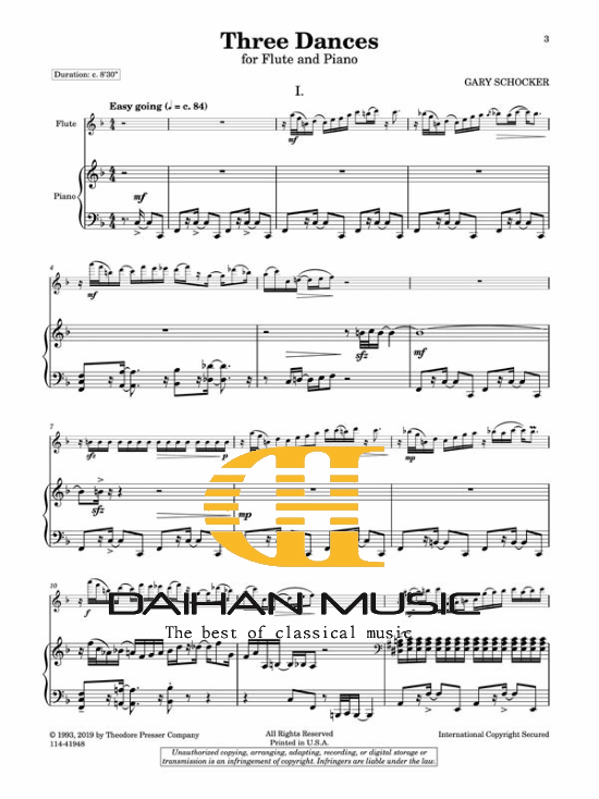Gary Schocker’s Three Dances for Two Flutes has long been a staple of the flute repertoire - in its original voicing with piano, as well as in transcriptions with string orchestra or band accompaniment, for alto saxophone duo with piano, and even in the composer’s flute quartet version of the famous Coffee Nerves movement. Schocker has arranged Three Dances for one solo flute with piano, incorporating all of the original work’s counterpoint, beauty, and spice, into this practical and concise instrumentation.